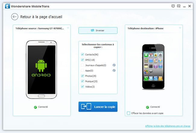 A l’aide de Mobile Trans vous pouvez transferer en quelques clics les contacts, les messages textes, le journal d’appel, calendrier, photos, musique, vidéo et application entre portables iPhone, Android, Windows Phone, Nokia (Symbian) ou BlackBerry.